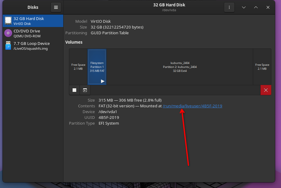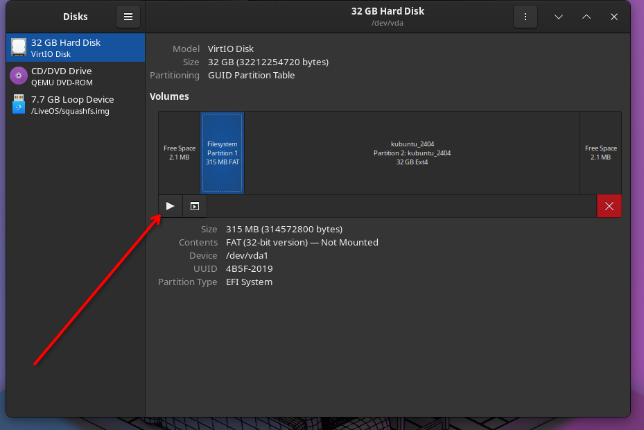 - Mount the EFI partition (if it's not already mounted) by clicking on the Play button